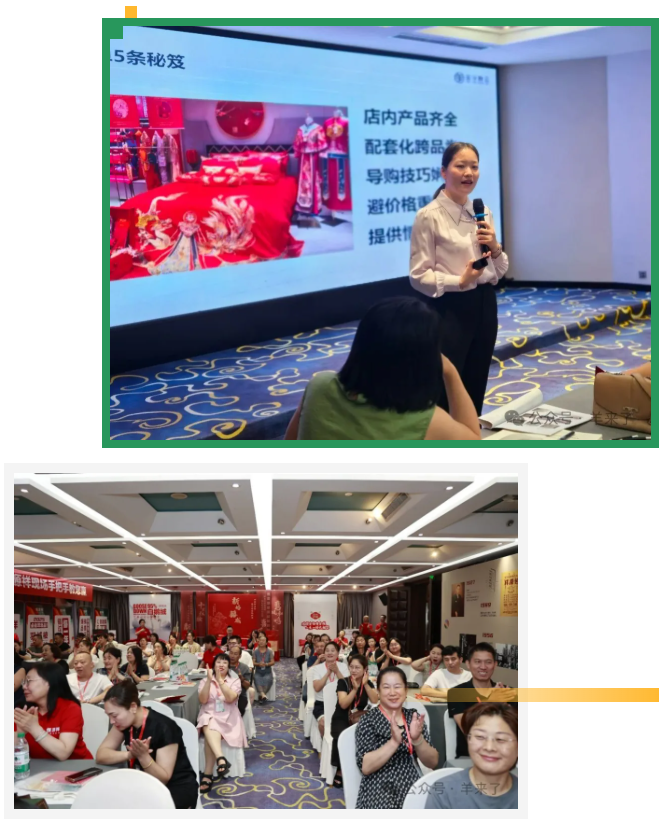 8月5日晚,恒源祥家纺长期合作的美学焕金团队导师张峻诚、倪俪铱为与会者讲授《如何做好家纺婚庆联单》课程。客户专注互动,直呼干货满满,表示不仅明晰了营销技巧,更希望借2025双春年婚庆旺季机遇提升业绩,争取更多市场份额。