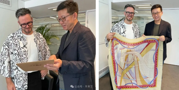 图:陈忠伟董事长向首席执行官Simon Cook介绍并赠送恒源祥限量高定文创丝巾
