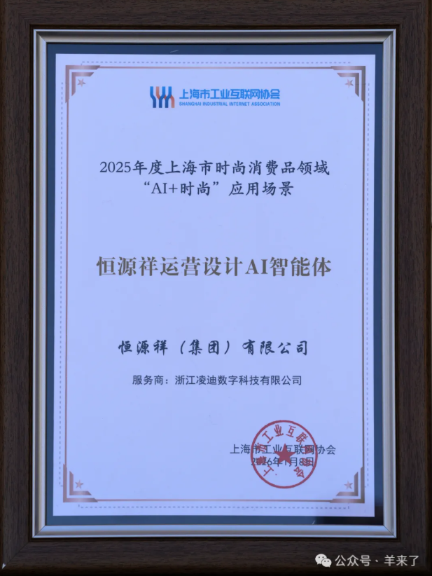 会上,百年品牌恒源祥(集团)有限公司凭借在“数字经济”转型领域的卓越实践与行业引领作用,携手浙江凌迪数字科技有限公司开发的“恒源祥运营设计AI智能体”入选2025年度上海市时尚消费品领域"AI+时尚"应用场景。