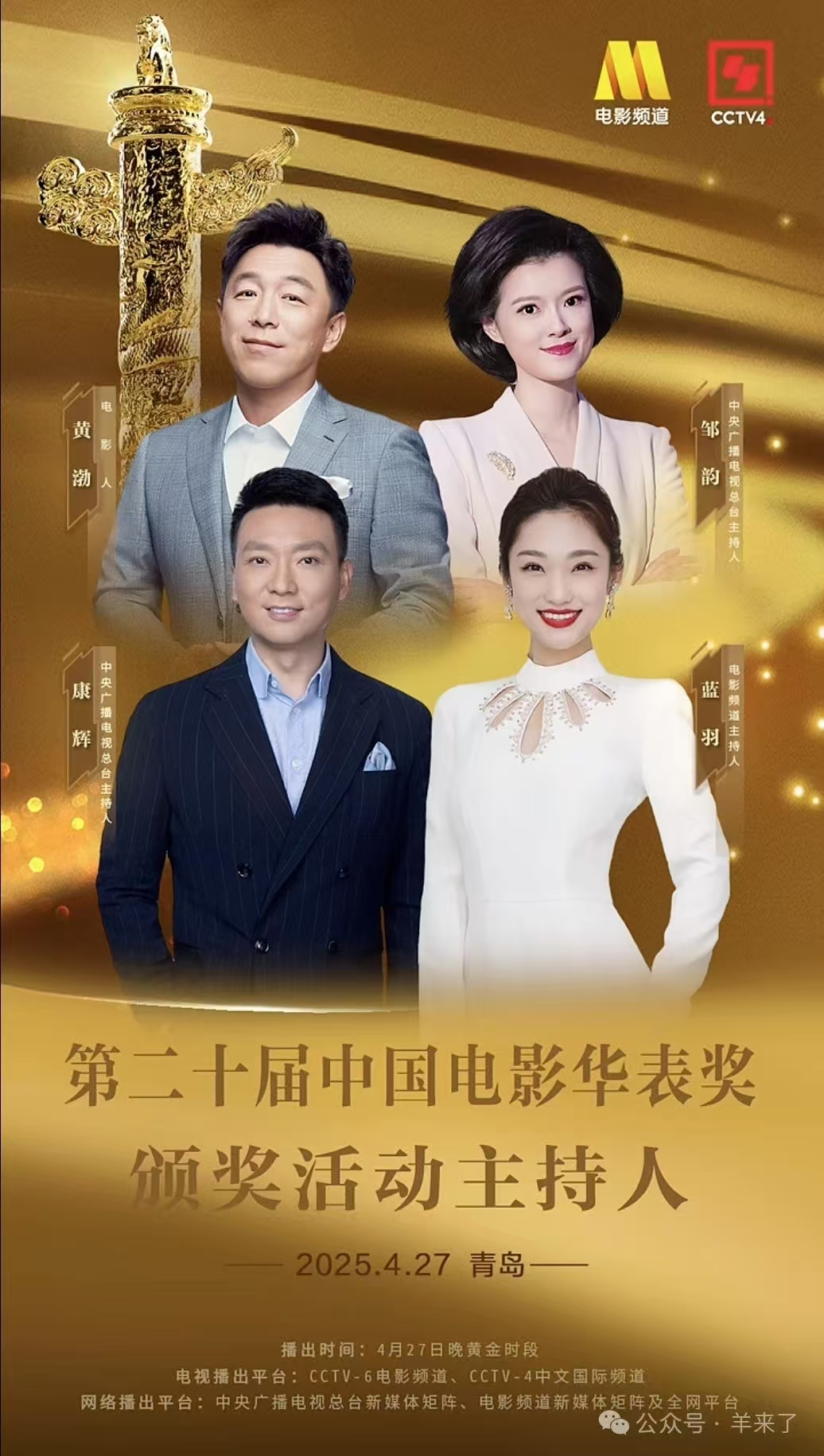 中央广播电视总台主持人康辉、电影频道主持人蓝羽、电影人黄渤、中央广播电视总台主持人邹韵将共同主持本届华表奖颁奖活动,与百位影人及全国电影观众一同见证中国电影荣誉时刻。