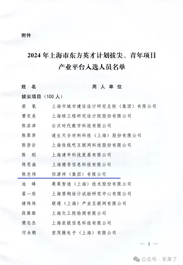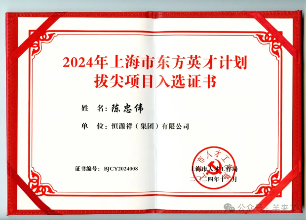 近日,上海市人才工作局公布了2024年上海市东方英才计划入选名单,恒源祥集团董事长兼总经理陈忠伟入选2024年上海市东方英才计划拔尖项目。