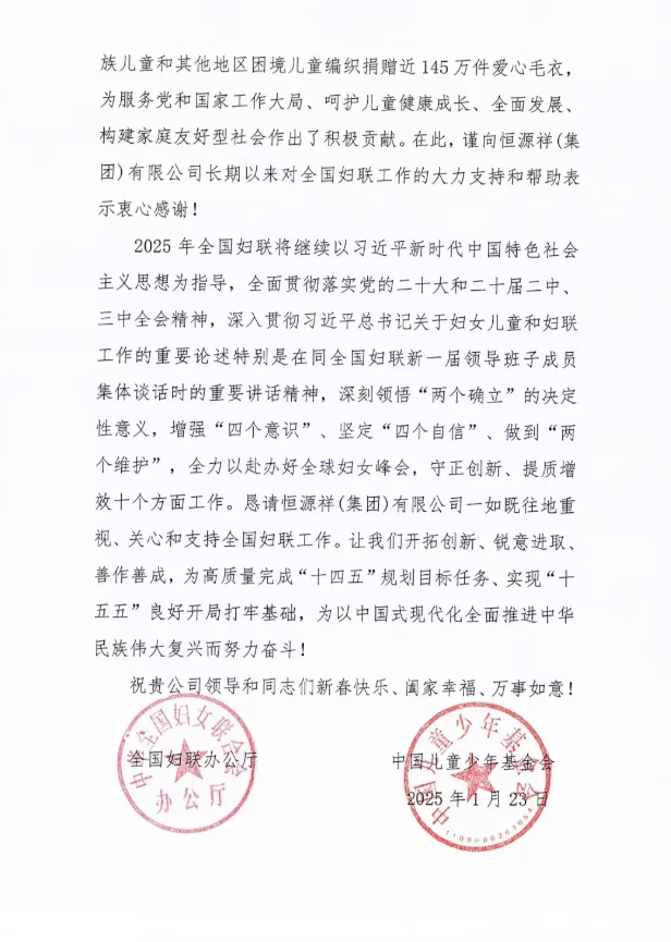 在全国人民都沉浸在阖家团圆的蛇年新春佳节之际,恒源祥集团收到来自全国妇联办公厅和中国儿童少年基金会的两封深情厚意的感谢信。这不仅是对恒源祥(集团)有限公司长期以来从事公益事业的肯定,更是对坚持不懈努力开展20年的“恒爱行动”的最高赞誉。
