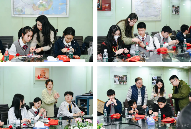大家用自己亲手制作的红色绒线球,围成爱心状,携手呈现了两所姊妹学校“真情一线牵”的跨地域友谊。