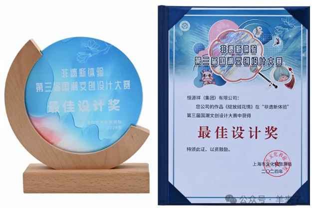 第三届国潮文创设计大赛面向全社会评选了一批“创新、美观、实用、可转化、有文化内涵”的国潮文创产品、作品和设计方案,组织开展社会宣传推广,鼓励、支持产品研发、市场销售、数字应用转化等合理利用活动,有效激发了非遗的内在潜能,让其在现代社会中焕发新的生机与光彩。近日,恒源祥作品《绽放绒花情》在此次大赛中荣获最佳设计奖。
