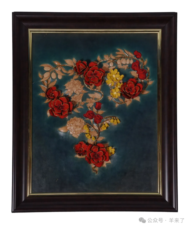 在作品的整体布局上,以上海绒绣技艺制作了四朵红色月季花为主体,以海派绒线编结技艺与皮料颜色相近的绒线编织了波斯菊和铃兰,以皮具雕刻技艺雕刻了绣球、月桂、桂花和橄榄和枝干,作品底面将上海绒绣和海派绒线编结这两项技艺连接在一起。画面上的七朵立体绒绣花,还可以应需取下,作为胸花或礼品花等用途。该作品在工艺材质上也有创新改进。