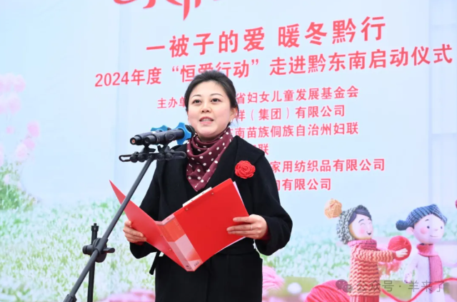 凯里市妇联二级主任科员杨艳同志宣读了“恒爱行动”倡议书。她呼吁更多的爱心人士参与到“恒爱行动”中来,为当地留守、困境儿童编织捐赠毛衣,让他们感受到社会大家庭的温暖。