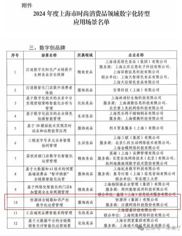 11月25日,上海市经济和信息化委员会发布了《2024年度上海市时尚消费品领域数字化转型应用场景名单的通知》,经企业自主申报和相关程序审定,审定“恒源祥全链路知识产权数字化运营管理”等35个数字化转型应用场景。
