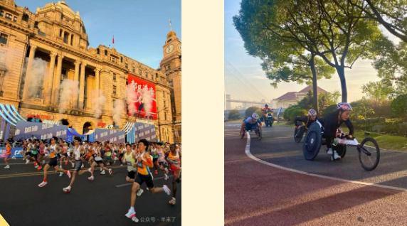 6点45分,竞速轮椅马拉松项目率先开赛。7点跑者们从外滩金牛广场起跑,沿途经过外滩、南京路步行街、黄浦滨江等,一路上领略气势恢宏的万国建筑博览群、摩登繁华的海派街区、静谧的江景与远眺的大桥,黄浦区段长约20.85公里,为跑者们营造了心旷神怡的精彩赛段。