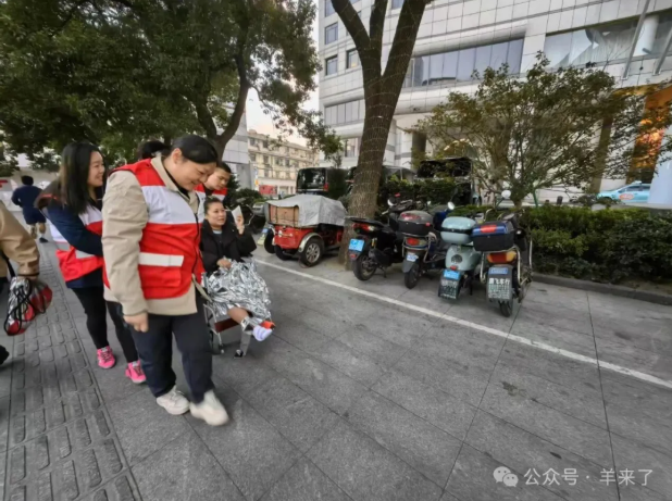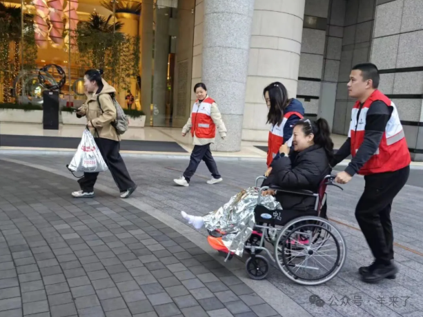 尚未开赛时,就有选手因着急赶路而摔倒,恒源祥志愿者第一时间上前搀扶、推来轮椅、披上保温毯,以娴熟的应急救护技能协助驻点医师现场处理,并护送伤者返回入驻酒店。热情的关怀和专业素养赢得了跑者的点赞,跑者也用身边的设备记录下了志愿者的身影。
