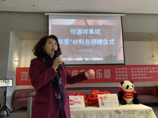 随后,王晓懿总监和蔡惠东副会长代表恒源祥向俱乐部捐赠200份“恒爱亲巧包”,其中包含编织成都市花芙蓉花的编织材料与教程。