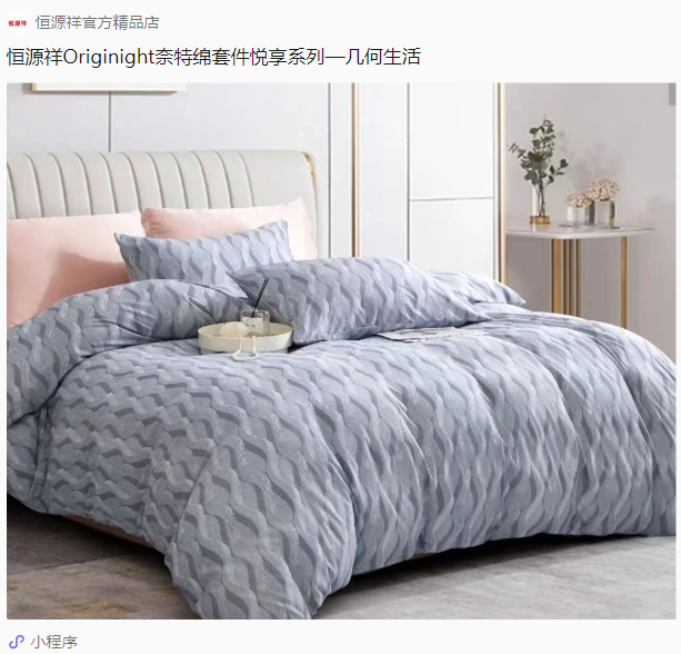 “Originight奈特绵”系列床品崇尚回归自然、追求纯粹生活方式的理念,采用针织线圈编织结构结合优质棉花,通过绿色印染技术,为消费者“织造绵密睡感”。欢迎感兴趣的朋友登录“恒源祥官方精品店”微信小程序商城选购和体验。
