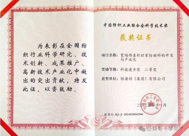 本次中国纺织工业联合会科技奖共评选出自然科学奖、技术发明和科技进步奖共计59项,桑麻学者奖4人。由恒源祥集团、恒源祥家纺一厂、武汉纺织大学、苏州大学等7家单位共同开发的“宽幅绵柔针织家纺面料的开发与产业化”项目荣获“中国纺织工业联合会科技进步二等奖”,也是家纺行业唯一获此殊荣的项目。