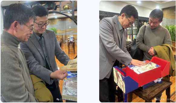 座谈结束后,陈忠伟董事长向来访嘉宾展示了恒源祥创立初期出版的手工编织书。随后与来访嘉宾互赠礼品,陈董向来访嘉宾赠送并介绍了恒源祥文创产品“恒源祥· 炬龙成祥生肖礼盒”。