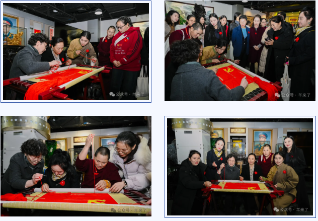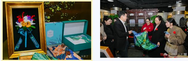 陈董还向来宾介绍了恒源祥以青海三江源为主题开发的相关文创产品。来宾体验了恒源祥传承的另一项非遗——海派绒绣,尝试用海派非遗的方式为党旗添上来自青海果洛的巾帼力量。