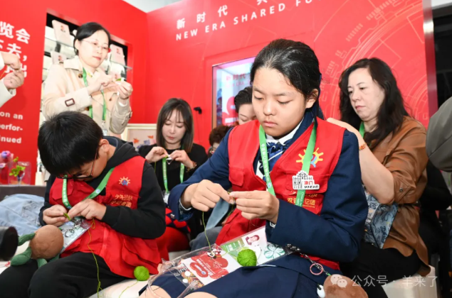 海派绒线编结上海市级传承人、恒源祥海派绒线编结工作室工艺师——励美丽与来自恒源祥非遗工作室的年轻工艺师:马俊、蒋馨瑶、缪逸栋、薛成霞,现场指导大家用“绕绒线”的方法,制作一朵进博会吉祥物“进宝”手中的四叶草。