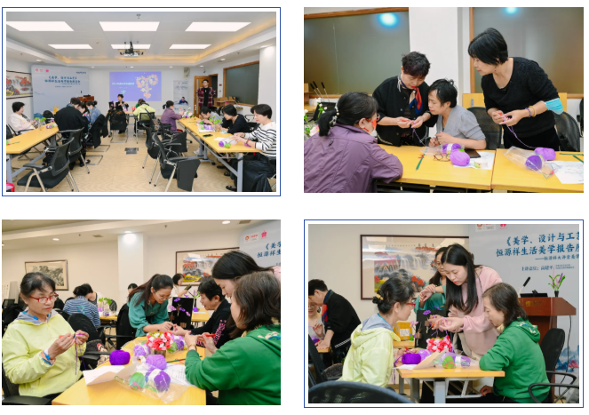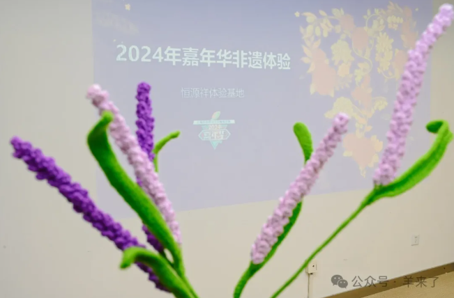 活动现场还特地布置了在2024第七届进口博览会上展出的绒线花四叶草盆景,在花团锦簇中,大家围坐一起,聚精会神地聆听老师的讲解和示范,迫不及待地上手尝试,在老师悉心指导下,一枝枝美丽而充满生机的“薰衣草”从一双双巧手中“诞生”。