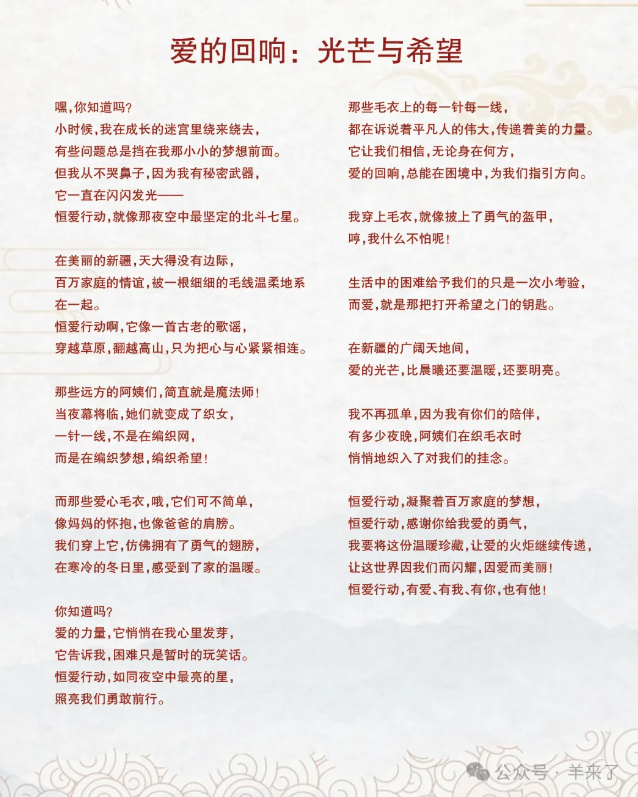 今年是“恒爱行动”升级为“恒爱行动——百万家庭亲情一线牵”公益项目十周年的重要里程碑。恒源祥联合中国儿童少年基金会始终坚持向困境儿童和新疆各族儿童传递党和政府的温暖和社会各界的关爱,10年间累计编织近64万件爱心毛衣,让内地与新疆家庭的心连得更紧、更亲、更近。
