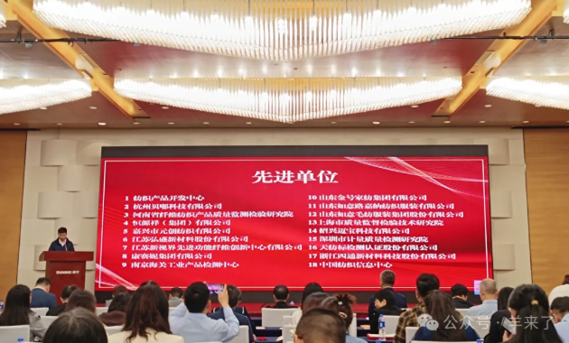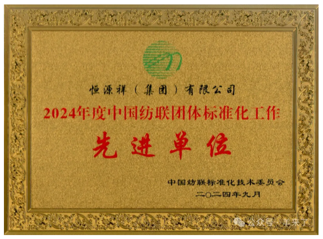 会议还对2017年以来入选工信部百项团体标准应用示范的16项中国纺联团体标准以及2024年牵头起草中国纺联团体标准的单位和个人进行了通报表扬。恒源祥集团喜获“2024年度中国纺联团体标准化工作先进单位”荣誉称号。