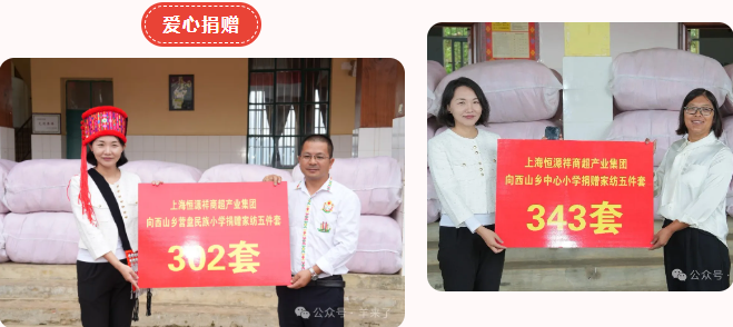 图:恒源祥“亿人善衣 衣被天下”公益项目分别向西山乡营盘民族小学和西山乡中心小学捐赠恒源祥家纺五件套
