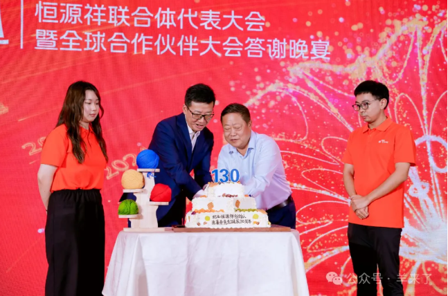晚宴由恒源祥集团董事长兼总经理陈忠伟作祝酒词。陈董首先讲到,今年是个很特别的年份:新中国成立75周年,澳门回归20周年,中法建交60周年,还是恒源祥创始人沈莱舟诞辰130周年,感谢所有嘉宾领导与恒源祥的家人们相聚苏州,参加了恒源祥代表大会暨恒源祥首届全球合作伙伴大会,对于百年恒源祥持续焕新、在传承中发展来说,这是一次具有里程碑意义的大会。陈董宣布,2027年百年恒源祥品牌庆活动举办地申办正式启动,欢迎全国各地的恒源祥人向集团踊跃提交申请报告。陈董指明,百年恒源祥将朝着全球化目标不断前行。