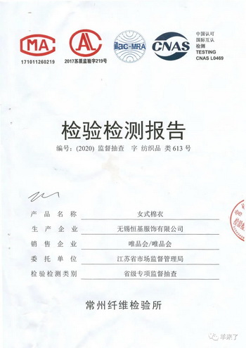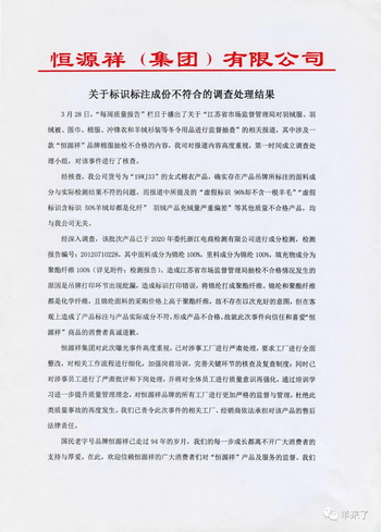 3月28日,“每周质量报告”栏目于播出了关于“江苏省市场监督管理局对羽绒服、羽绒被、围巾、棉服、冲锋衣和羊绒衫装等冬令用品进行监督抽查”的相关报道,其中涉及一款“恒源祥”品牌棉服抽检不合格的内容,我司对报道内容高度重视,第一时间成立调查处理小组,对该事件进行了核查。