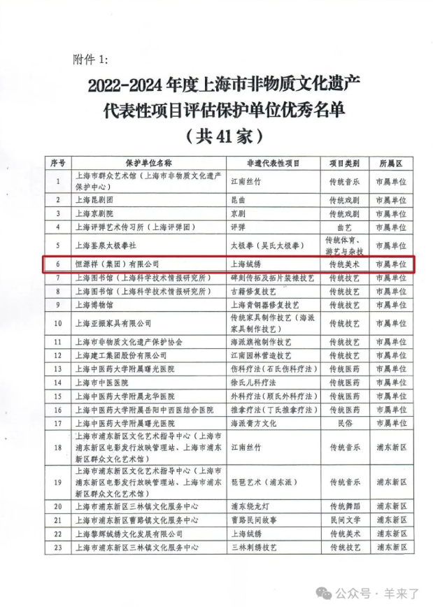 近日,在2022-2024年度上海市非物质文化遗产代表性项目评估中,恒源祥作为上海绒绣和海派绒线编结技艺两项非遗项目的市级保护单位,荣获“优秀”等次。