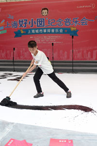 来自好小囡四大团队之一的好小囡万能双手俱乐部的代表---12岁的喻文添小朋友的巨型书法表演,将整场音乐会推向了高潮。在钢琴独奏《闪闪红星放光彩》的旋律中,喻文添拿起巨笔,写下了四个刚劲有力的毛笔字——自强不由息,相得益彰的精彩表演,赢得了全场喝彩。