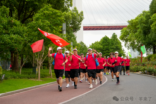 身着恒源祥精心定制的红色速干T恤,长跑队伍从世博黄浦体育园(外马路 1353 号)意气风发地出发。鲜亮的红色衣袂与左袖红黄相间的工会徽标交相辉映,在黄浦滨江绿道上绵延成一道夺目而富有活力的流动风景线,为清晨的江畔注入蓬勃生机。队伍沿着蜿蜒的滨江绿道一路前行,途经张拉幕、远望一号船坞等标志性建筑,最终抵达南园滨江绿地,全程约 3.8 公里的路程串联起两岸风光。