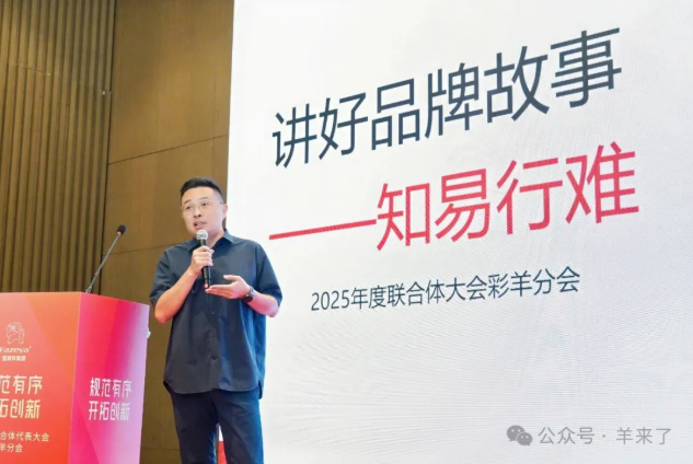 彩羊产业服饰事业部总经理侯旭迎以"讲好品牌故事——知易行难"为主题发表讲话。他与大家探讨了老字号品牌如何通过战略定力、品牌焕新、产品创新和渠道升级实现转型。他重点分享了国内某知名品牌从"土气老牌"成功蜕变为"时尚国际化"品牌的典型案例,通过聚焦核心品类、提升产品设计与功能、进驻高端商场、参与国际时装周等举措,实现了营收与利润的显著增长。通过学习这些成功的品牌经营经验,他提出彩羊品牌应当坚持长期主义,抵制短期诱惑,通过系统化的全产业链升级,持续提升产品力与品牌力,最终赢得新一代消费者的认可与信赖。