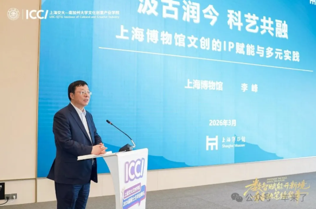 上海博物馆文化创意有限公司董事长、上海市博物馆协会常务副会长李峰,立足文博资源与文创教育融合做了主题分享,寄语毕业生传承中华文脉、以创意活化文化遗产,推动文化传承与产业创新双向赋能。